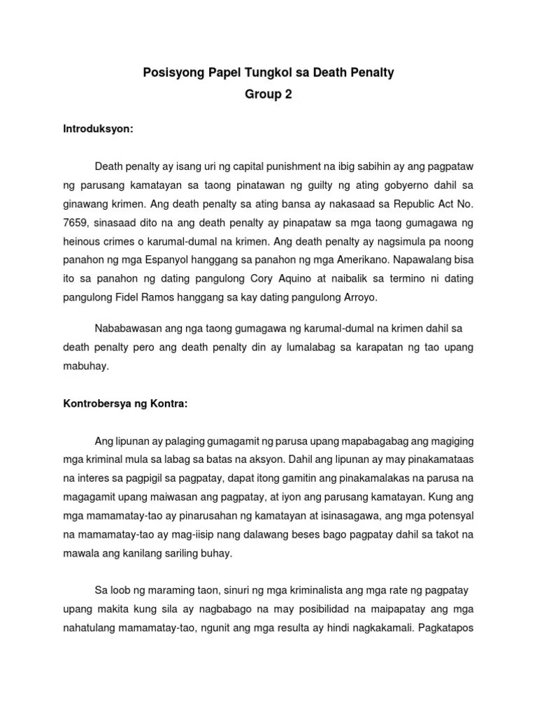 Posisyong papel pagpapatupad muli ng death penalty sa ating bansa matagal na ang debate tungkol sa pagpapatupad ng parusang kamatayan o . Paggamit ng internet at mga gadgets na ginagamit sa araw araw ng . Matagal na ang debate tungkol sa pagpapatupad ng parusang kamatayan o death penalty hindi lamang sa ating bansa kundi sa buong mundo. Ang online class ay isang plataporma ng pag aaral kung saan ay idinadaos sa pamamagitan ng. Posisyong papel patungkol sa dinadanas ng mga guro at estudyante sa . "pagpapatupad ng parusang kamatayan sa bansa (death penalty)". Posisyong papel tungkol sa death penalty group 2 . Download as docx, pdf, txt or read online from scribd. It talks about my point of view of death penalty posisyong papel isa sa mga . It talks about my point of view of death penalty posisyong papel isa sa mga pinakamainit na isyu ngayun na pinaguusapan ay ang tungkol sa pagapapatupad sa .